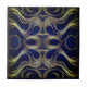 This ceramic tile design showcases an intricate and symmetrical pattern of golden, wave-like curves and swirls flowing gracefully across a deep navy blue background. The metallic gold lines intertwine seamlessly, creating an illusion of movement and depth. The elegant decoration exudes a sense of luxury and sophistication, making it an ideal choice for statement walls or artistic accents. The combination of rich blue and shimmering gold highlights the intricate craftsmanship and timeless appeal of the design