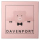 Baldosa cerámica personalizada con un dibujo de la cara de un lindo cerdo rosado. Llevando una corbata negra. Levantado por sus pezuñas negras y mirando hacia usted. Dibujo tierno y caprichoso. Envuelto en un fondo rosado con algunos corazones desvanecidos aquí y allá.
