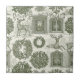 A vintage-inspired green toile seamless pattern ceramic tile featuring graceful deer resting and standing among winter foliage. The design includes evergreen trees, holly leaves, pinecones, and delicate snowflakes. This elegant and timeless illustration evokes a peaceful woodland Christmas scene.