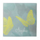 Patrón de mariposa amarillo bonito sobre un fondo foliage de color gris-azul. Personalizado con su nombre en el guión blanco de moda.