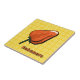 Una pimienta de chile habanero naranja está decorada con patrones inspirados en diseños de baldosas de cemento cubano y se sienta en un fondo amarillo con una versión más pequeña del mismo patrón y una etiqueta de guión en la esquina. Esta pimienta muy picante fue cultivada originalmente en la península de Yucatán, pero recibe su nombre de La Habana en Cuba debido al fuerte comercio a través de esa ciudad.