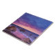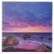 Baldosas de cerámica con una bonita fotografía con llamativos colores morados, azules y rosas al atardecer. Una línea costera de bonito con rocas.