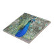 Baldosa cerámica que muestra la imagen de un hermoso pavo real azul con coloridas plumas de fantasía. Seleccione su tamaño de mosaico. ¡Hace un gran trivet de cocina!