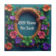 Flores vibrantes y hojas verdes, colocadas sobre un fondo verde azulado. El marco es de madera y la decoración floral de colores como el naranja, el rosa, el violeta y el verde crea una composición artística y animada.