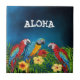 Aves tropicales, loros en azul, amarillo y rojo sentados sobre hojas de palma verdes. Decorado con flores tropicales. Un cielo azul oscuro como fondo. Grandes letras blancas y el texto: Aloha Decoración perfecta para tu casa de verano o casa de playa!
