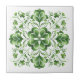 Esta baldosa es un elegante diseño verde en un estilo damasco, mostrando una disposición simétrica e intrincada de tréboles y hojas estilizadas. Este patrón presenta formas de trébol más audaces y grandes en el centro, irradiando hacia fuera con líneas curvas finas y tréboles más pequeños que mejoran la armonía y el flujo de la composición. El conjunto es decorativo, refinado y de inspiración irlandesa, ideal para celebrar la naturaleza, la suerte o el Día de San Patricio. El fondo es blanco.