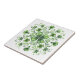 Esta baldosa muestra un diseño de mandala ornamental, simétrico, centrado en las hojas de trébol verde. Un gran trébol intrincado de cuatro hojas ocupa la posición central, con sus hojas detalladas con gradientes de color verde oscuro, finas notas blancas y delicados acentos negros. Alrededor del centro, los tréboles más pequeños se intercalan con elegantes y giratorias estampaciones tipo vid y motivos estilizados de hojas. El diseño es muy complejo, con un sentido de flujo creado por las viñas de salida y una distribución equilibrada de los tréboles. El conjunto es visualmente dinámico y armonioso, con un estilo depurado y decorativo. El fondo es blanco.