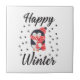 Ilustracion pingüino, copos de nieve y texto: Feliz invierno.