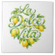 Italian ceramic tile : A fresh and elegant watercolor illustration featuring the hand-lettered phrase “La Dolce Vita,” beautifully intertwined with vibrant yellow lemons, lush green leaves, and delicate white blossoms. Inspired by the Italian art of living, this design evokes sunshine, Mediterranean charm, slow living, and joyful simplicity.