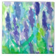 Baldosas de cerámica floral adornadas con un jardín de flores de lavanda floridas pintadas con acuarela en diferentes tonos azules, violetas y verdes.