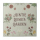 Una pantalla de jardín vintage con elementos florales y texto personalizado, en tonos verde, rojo, rosa, blanco y amarillo.