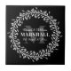 Tipografía de flor calligrafía tipografía monograma mosaico de cerámica en blanco y negro - Elegante regalo de cerámica monogramada en blanco y negro para recién casados una pareja que presenta un monograma personalizado, nombres de novio y novia, apellidos y plantillas de fecha boda rodeados por una audaz corona de arte floral. Un delicioso regalo de mantenimiento para el fiesta o regalo de boda de la pareja. ©sweetwhimsypaperie