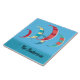 Baldosas de cerámica decorativa con temática de kite azul con texto personalizable. Las cometas de los kitesurfistas coloridos sobrevuelan el océano de verano.