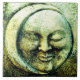 Sol sonriente y enmarcado por una luna creciente. Hecho en piedra con colores verdes, dorados, bronce y negro.