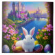 Digital art of an adorable white rabbit in a basket, surrounded by decorative colorful eggs, flowers and roses, creating a cheerful and festive atmosphere. In the background, a serene blue lake is framed by magical castles, gardens and flowery ornaments that transport the viewer to a fairytale world.