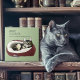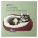 Un gato con manteles en su cama de gato color burdeos defendiendo su pereza.