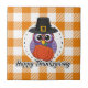 Oveja peregrina sobre un fondo de patrón de búfalo blanco naranja con la leyenda "Feliz Día de Acción de Gracias".