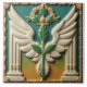 A square tile with a symmetrical design featuring a central green plant with leaves, flanked by white wings and columns, all set against a two-tone background of teal and yellow. The design is framed by an ornate border. The plant has a central stem with green leaves branching out, and a golden wreath with green leaves and a central golden flower is positioned above the plant. The wings are white with detailed feather patterns.