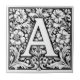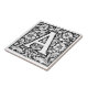 Letra medieval iluminada con mosaico de cerámica ilustracion vectorial blanco y negro de la carta en un elaborado estilo medieval, creado al estilo de Albrecht Dürer. El diseño es un cuadrado con un gran motivo floral central rodeado de patrones geométricos simétricos y remolinos.