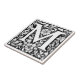 Letra medieval iluminada M Cubierta cerámica ilustracion vectorial blanco y negro de la carta en un elaborado estilo medieval, creado al estilo de Albrecht Dürer. El diseño es un cuadrado con un gran motivo floral central rodeado de patrones geométricos simétricos y remolinos.