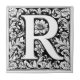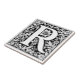 Letra medieval iluminada R mosaico de cerámica ilustracion vectorial blanco y negro de la carta en un elaborado estilo medieval, creado al estilo de Albrecht Dürer. El diseño es un cuadrado con un gran motivo floral central rodeado de patrones geométricos simétricos y remolinos.