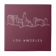 Características del este diseño un ilustracion dibujado mano del horizonte de Los Ángeles en un fondo magenta.