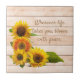 Toda la dura belleza de los girasoles se acompaña en un rincón de un marco rústico de madera. El diseño tiene tonos ocres mutados, amarillos brillantes, rosa y verde