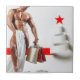 Navidades de SlipperyJoe comprando un árbol de espirales de papel blanco coronado por una vibrante estrella roja que golpea el tema de las vacaciones atrevida banda de escarlata corriendo horizontalmente sexy hombre muscular de pecho parcialmente vestido hoja de cama artística sin camisa regalo de tipo bolsos de compras estacionales regalos de orgullo gay alegrías LGBTQIA