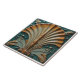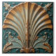 Un diseño de conchas marinas levantadas y estilizadas en el centro, con una paleta de colores verde azulados, dorados y crema. La concha de mar está compuesta por segmentos de cinta que se abren de un tallo central, con la pintura de oro que parece angustiada, revelando crema por debajo. El fondo es verde azulado, adornado con motivos florales y ornamentados en tonos dorados y crema. El estilo general recuerda a los detalles arquitectónicos vintage, con una textura un poco curtida que le confiere un encanto antiguo.