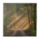 Esta foto ofrece los rayos ligeros que fluyen a través de la niebla que ilumina los árboles del abeto y de cedro en un camino de tierra del país.