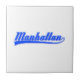 Manhattan, Nueva York, escrito con un swash (cola). Fuentes en blanco y azul. Diseño de texto original.