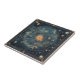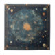 Mapa celeste de estilo antiguo muy detallado que presenta el Sol en el centro, rodeado de senderos orbitales concéntricos de planetas como Saturno, Neptuno, Urano, Plutón y la Luna. Las constelaciones, las estrellas y los símbolos zodiacales se ilustran intrínsecamente con un fondo azul profundo, acentuado en tonos dorados y cálidos. Perfecto para los amantes de la astronomía, los entusiastas de la astrología y los aficionados al arte cósmico vintage, este embaldosado cerámico captura la belleza intemporal del cielo nocturno y la navegación celeste.