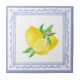 Baldosas de cerámica de inspiración artística inspiradas en las vacaciones mediterráneas, con un desnivel de color azul acuático y ilustracion de limones en el medio, diseñadas por LakeIsland.