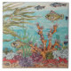 Con peces coloridos, un erizo de mar morado, coral amarillo, una estrella de mar, algas marinas verdes y conchas, esta es una reproducción directa de azulejos #3 en mis 9 - mural de vida marina de azulejos. Hay nueve azulejos en la serie, cada uno vendido por separado por Zazzle. Si compra las nueve baldosas, tendrá un mural de baldosas de la escena submarina cohesivo, colorido, divertido, de aproximadamente 54" si utiliza las baldosas de 6", o aproximadamente 38,25" si utiliza las baldosas de 4 1/4". Originalmente fue pintado a mano y el horno disparado por un ceramista profesional, utilizando vidrieras y contrachapados de cerámica, como un mural de azulejos de ducha personalizado, acentuado con bordes de azulejos de vidrio. El original mural, con su atractivo costero-marino, era la decoración de una casa de playa.