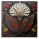 Escultura cuadrada de relieve sobre un fondo negro, con una flor blanca central con pétalos en capas, flanqueada por dos grandes hojas con motivos en tonos marrones y rojos. Las flores amarillas pequeñas se reparten por los bordes y toda la composición está enmarcada por un borde de viñas y hojas marrones.