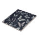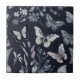 Una baldosa de cerámica botánica de mariposa para decoración casera. Esta elegante baldosa decorativa cuenta con hermosas mariposas sobre un fondo morado oscuro con flores botánicas y plantas.