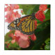 La mariposa de Monarch brillante, que aparece en el fondo de las flores rojas, hace una hermosa imagen en baldosas de cerámica. ¡Los ojos capturan un acento decorativo!