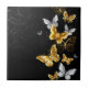 Oro, joyas y mariposas blancas sobre fondo negro. Mariposa dorada.