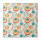 Esta baldosa cerámica tiene un diseño moderno de mediados de siglo de círculos concéntricos en oro, naranja y turquesa sobre un fondo blanco.