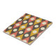This ceramic tile features mid century modern white circles placed on harlequin diamonds pattern in terracotta and mustard yellow on taupe background. It's retro geometric neutral tones to your home decor