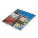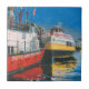 Una pintura de Portland, Maine, "Ciudad de Portland" y dos ferris de Casco Bay atracaron en el muelle del estado de Maine en una baldosa decorativa. Esta colorida pintura utiliza predominantemente colores primarios y detalles intrincados del barco Portland Fire, al tiempo que incorpora un estilo de pintura para dar la textura de la pintura y el interés visual y representa una escena típica de verano en Portland, el vibrante frente de agua de Maine. Los reflejos rojos y amarillos claros del agua azul de mármol dan a los barcos una sensación de movimiento constante, incluso cuando están atracados.