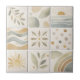 Each tile is uniquely painted with soft, earthy tones—off-white, beige, sage, ochre, and slate blue—featuring botanical shapes, sunbursts, abstract forms, and geometric patterns for a soft, modern, and organic feel.