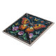 Una mariposa colorida con alas naranja y amarilla, rodeada de flores y mariposas más pequeñas, se sitúa sobre un fondo azul oscuro dentro de un marco cuadrado ornamentado.