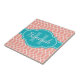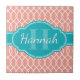 Estiloso y moderno patrón de entramado rosa y negro en el fondo, coronado con una brillante etiqueta azul verde azulado con un nombre de personalizable y una plantilla de monograma.