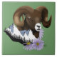 Retrato de una oveja Ram / Bighorn con montañas y flores púrpura en un fondo verde