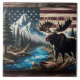 Un alce se alza junto a un sereno lago con un telón de fondo de montaña y un diseño de bandera estadounidense, rodeado de altos árboles de siempre verde y agua que fluye.