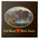 Una mami mamá y su lindo ternero con un lago y montañas a lo lejos. También aparece el eslogan "Cold Noses (A red heart) Warm Hearts".