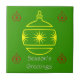 Los adornos de las vacaciones (redondos, en forma de bola, con una banda central de estrellas) adornan esta "baldosa de saludo". El gran adorno central es amarillo con pequeños adornos rojos en las cuatro esquinas. "Los saludos de la temporada" está abajo.