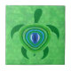 Una tortuga marina verde con un intenso ojo azul en la espalda. Los azulejos están disponibles en dos tamaños: 4,25 x 4,25 pulgadas y una gran superficie de 6 x 6 pulgadas.