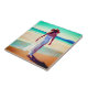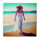 Baldosas de cerámica en el ilustracion de una mujer con un vestido blanco flotante y un gorra de gran maleza camina a lo largo de una tranquila playa de aguas azules vibrantes. Las montañas distantes y el cielo despejado crean un ambiente tranquilo y pintoresco.
